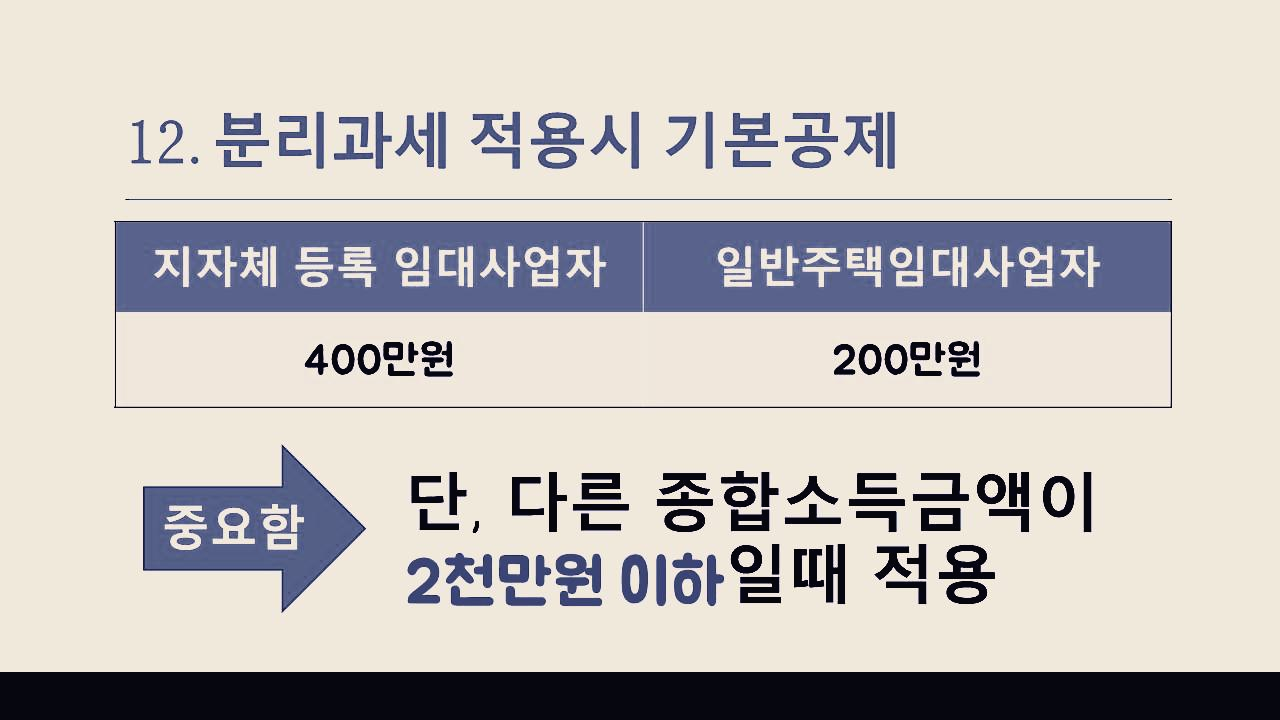 분리과세 적용시 필요경비율을 60%(50%)를 적용하도록 하였는데 일반적으로 종합소득세 신고할 때보다 더 유리하게 적용되었습니다. 이것도 일반적인 사업자에 비하면 혜택입니다.
