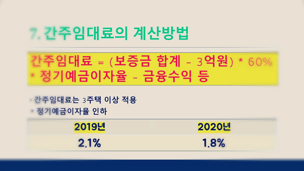 2020년부터는 간주임대료에 대한 정기예금이자율이 1.8%로 떨어져 쬐끔은 세금부담이 줄어들게 되었습니다. 2019년 귀속분에 대하여 신고할 때는 2.1%의 간주임대료를 적용하셔야 합니다.
